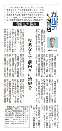- 令和4年6月5日、神戸新聞朝刊「カルテQ&A」に潰瘍性大腸炎でお悩みの読者からの質問に、当院院長が回答した記事が掲載されました。